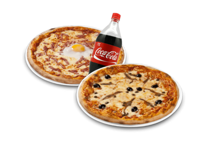 2 Pizzas méga au choix + 1 Maxi coca 1.25L.
